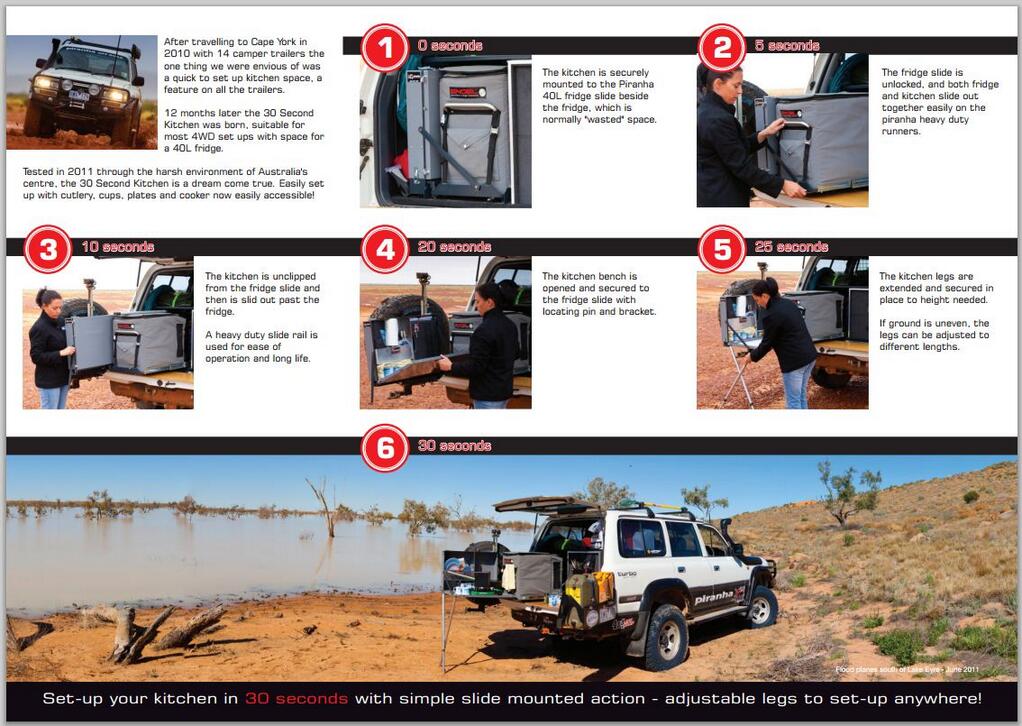 Introducing a neat idea from Piranha Offroad in Australia. I first saw this product advertised during a 4WD TV show and immediately liked the concept. I will admit that I have not seen it, or had the ability to test the durability however the concept is unique and makes life on the road that much easier. The concept is fairly clear: a small kitchen and table mounted next to the fridge which can be setup in minutes allowing for easy access to the cooker, crockery and cutlery.